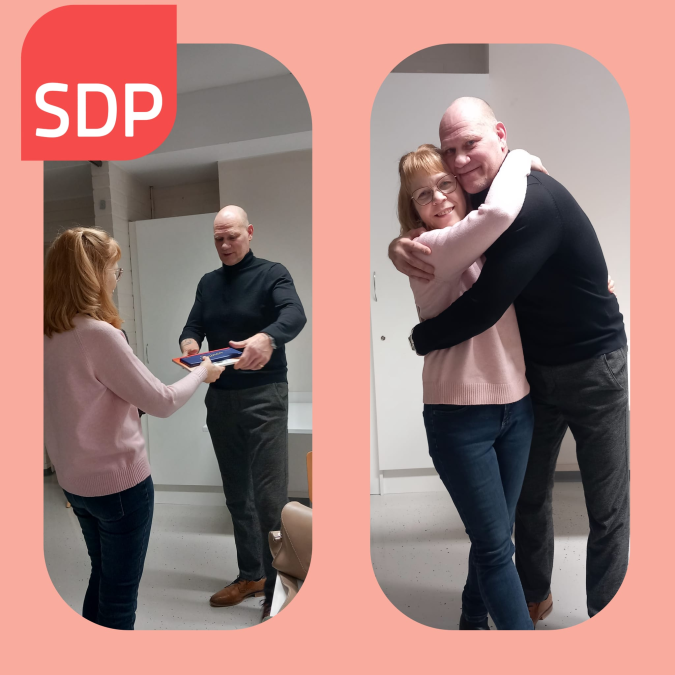 Kai on ollut omistanut puolueosaston jäsen sekä loistava puheenjohtaja. Kuvassa Pirjo-Riitta luovuttaa Kaille kirjan Torpasta Pirttiin 1906-2006 sekä suklaata.