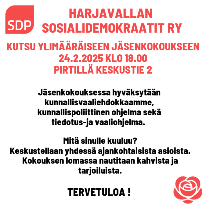 SDP jatkaa Suomen suosituimpana puolueena 💪🌹 Tästä on hyvä jatkaa työtä oikeudenmukaisuuden, tasa-arvon ja solidaarisuuden eteen myös vuonna 2025. Sitä todella tarvitaan tässä ajassa, tule mukaan SDP:n joukkueeseen! Lähde ehdolle kuntavaaleihin 👉https://sdp.fi/vaalit-2025 Liity jäseneksi 👉https://www.sdp.fi/liity-jaseneksi/ Mikäli kiinnostuit tai harkitset kuntavaaleihin lähtemistä voit ottaa yhteyttä myös Harjavallan Sosialidemokraatteihin: Puheenjohtaja Janne Ala-Myöntäjään p. 040 5911604 Varapuheenjohtaja Pirjo-Riitta Tuomelaan p. 040 5092199 Jäsen Tanja Laineeseen p. 044 2426152 Tervetuloa mukaan!